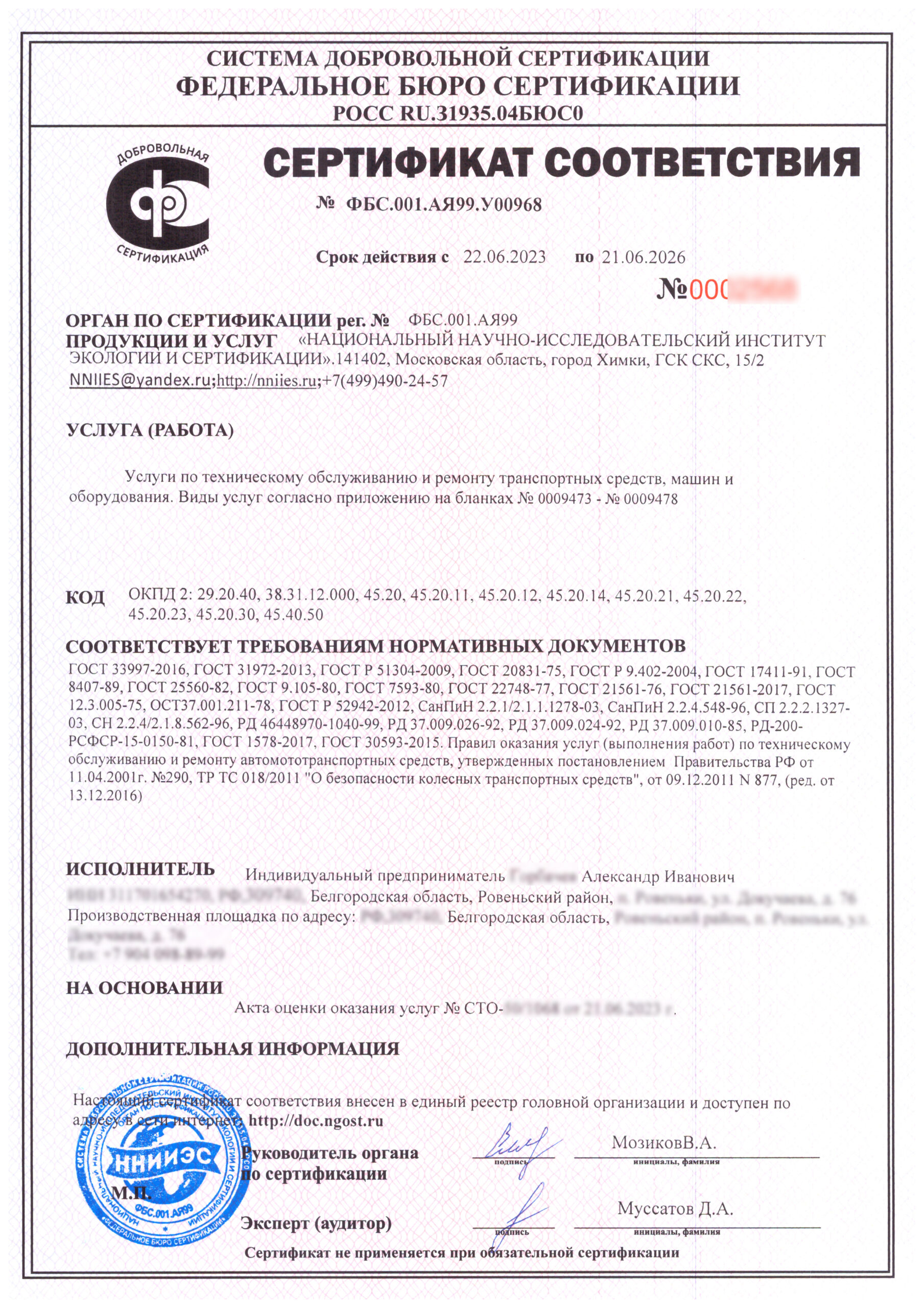 сертификатов СТО